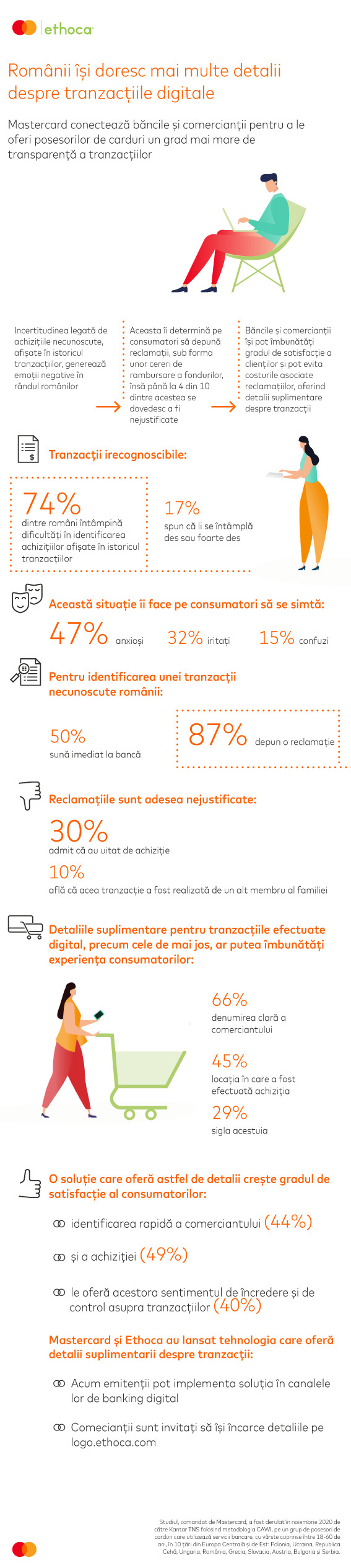 Respondenții studiului comandat de Mastercard confirmă că își doresc să vadă detalii suplimentare despre cumpărăturile realizate cu cardul, în istoricul tranzacțiilor, pentru a putea identifica achizițiile mai ușor și mai rapid. În opinia românilor, cele mai utile detalii ar fi denumirea comerciantului (66%), sigla acestuia (29%) și locația în care a fost efectuată achiziția (45%). Un istoric mai complex al tranzacțiilor efectuate cu cardul ar sprijini consumatorii în identificarea rapidă a comerciantului (44%) și a achiziției (49%), și, mai ales, oferă deținătorilor de carduri sentimentul de încredere și de control asupra tranzacțiilor (40%).
