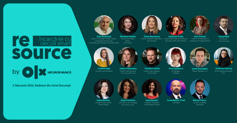 Peste 500 de reprezentanți ai mediului de business românesc, angajatori și specialiști în resurse umane, sunt așteptați pe 5 februarie 2026 la o nouă ediție a ReSource by OLX Locuri de Muncă. Sub tema ”From Then to When” evenimentul va reuni la Radisson Blu Hotel din București importanți lideri din domeniu, ce vor participa la discuții interactive, segmente de prezentări, paneluri și keynote speeches, pe teme de interes, precum: leadership, cultură organizațională, recrutare și Talent Acquisition, sănătate psiho-emoțională, tehnologie & AI, retenția și motivarea angajaților, viitorul muncii și skill-urile viitorului.